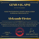 2024-cü il ərzində Banqladeşin Agile Fotoqrafiya Cəmiyyəti (APS) tərəfindən təşkil edilən müxtəlif fotomüsabiqələrdə uğurlu iştirak etdiklərinə görə beynəlxalq dərəcəli fotoqraflar Valeriy Xlızov Master (M.APS) və Aleksandr Firstov Genius (G.APS) fəxri sertifikatlara layiq görülüb.